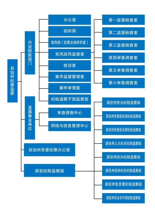 派驻机构:设有8个派驻纪检监察组,驻州党委办公室纪检监察组、驻州党委组织部纪检监察组、驻州党委政法委纪检监察组、驻州人大机关纪检监察组、驻州政办纪检监察组、驻州政协机关纪检监察组、驻州发改委纪检监察组、驻州农业农村纪检监察组。
